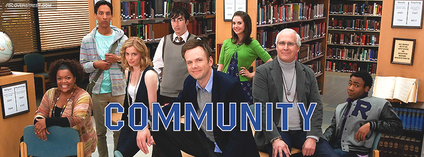 Description: A group of people standing in a library with the words community over them and a picture of a man in a suit.
