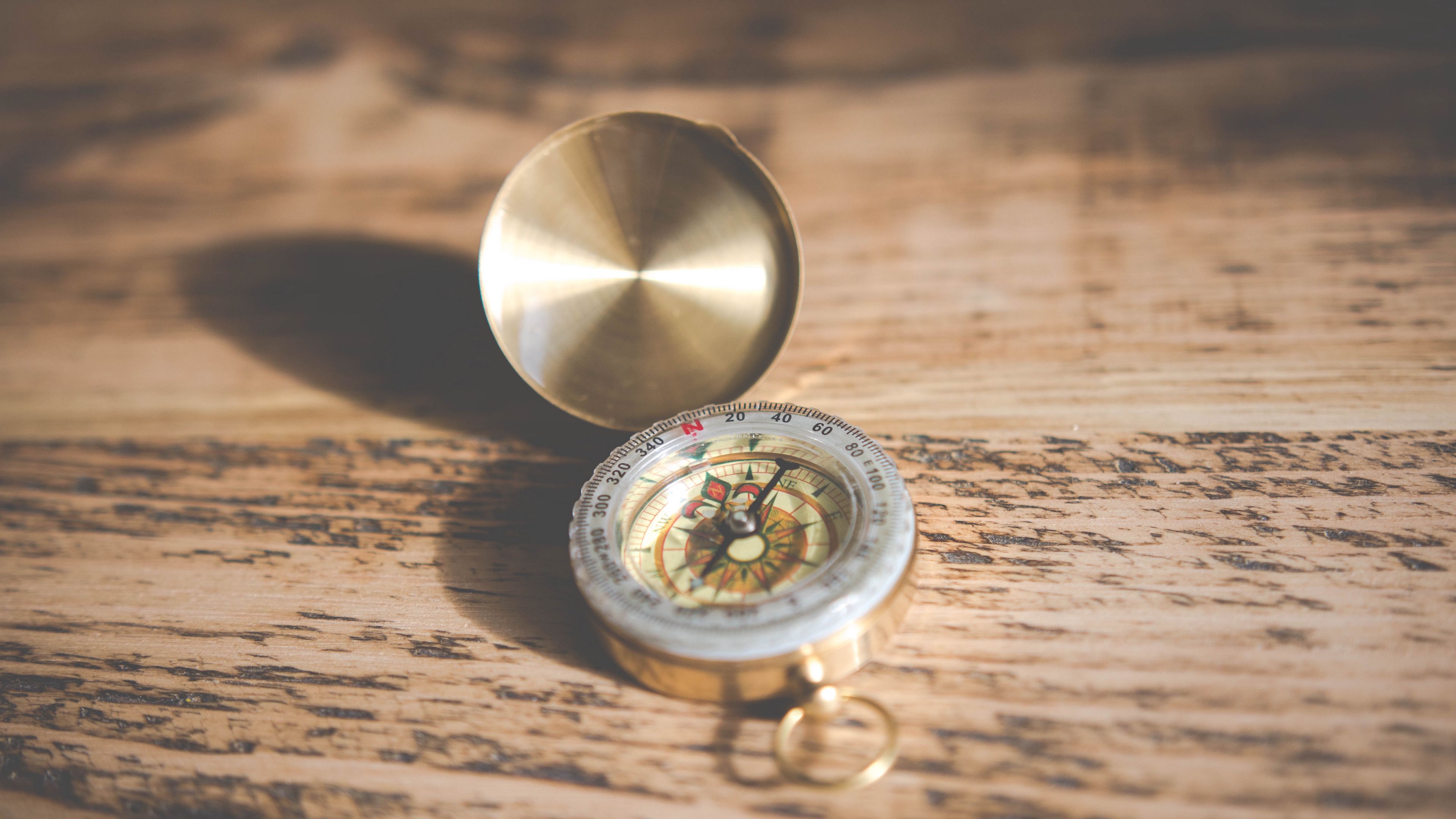 Description: A compass on a wooden table with a metal case on it's side and a keychain.