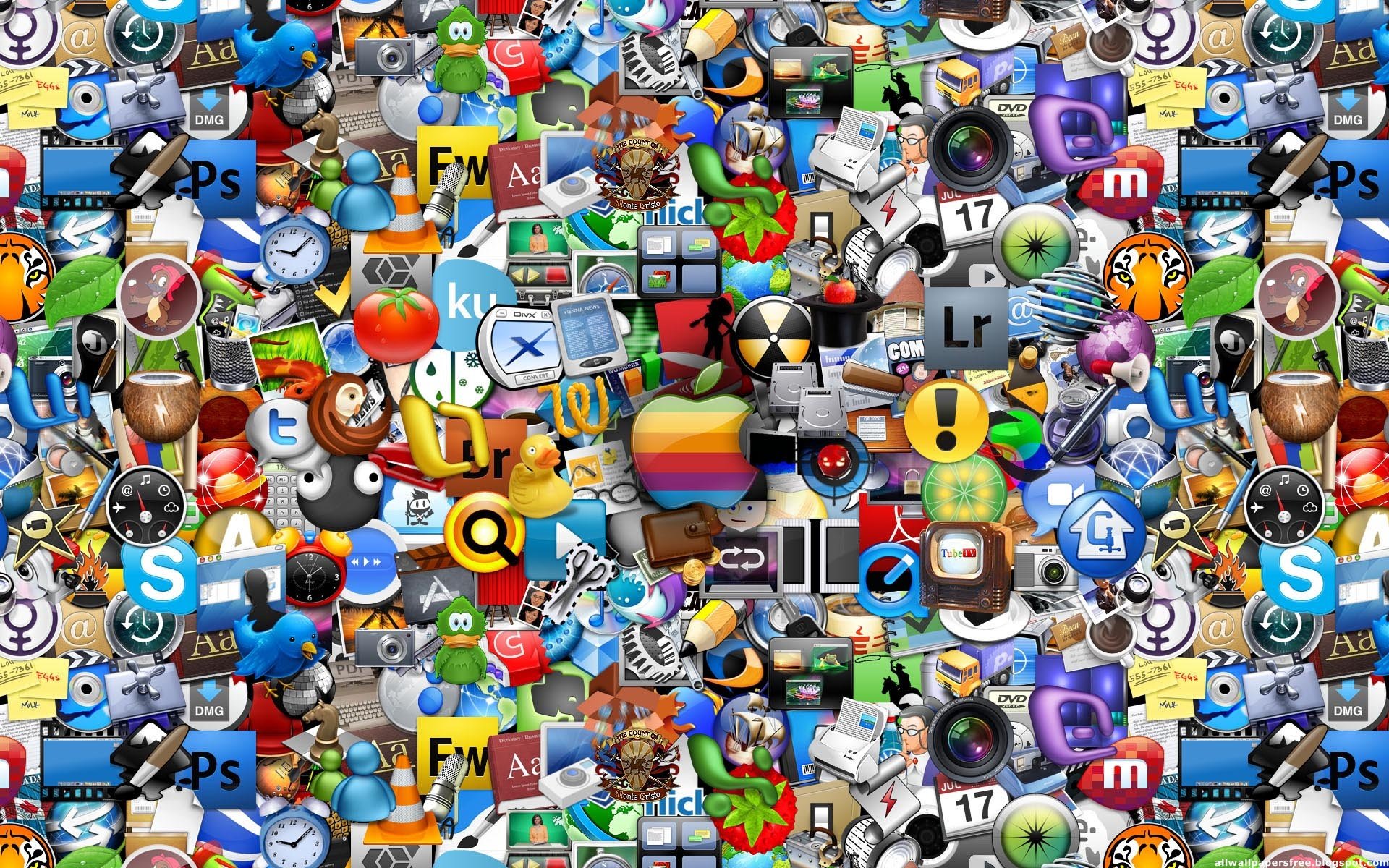 Description: A very large pile of different types of computer icons and symbols on a wallpaper background with a lot of different colors.