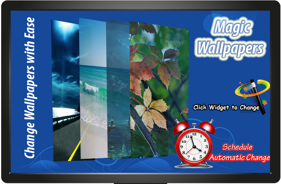 Description: A computer monitor with a picture of a clock and a picture of a tree and a wave on the screen.