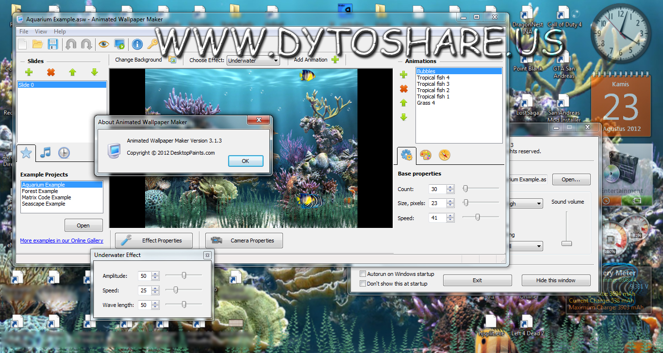 Description: A computer screen with a clock and a picture of a coral reef on it's side and a window with a clock on the side.