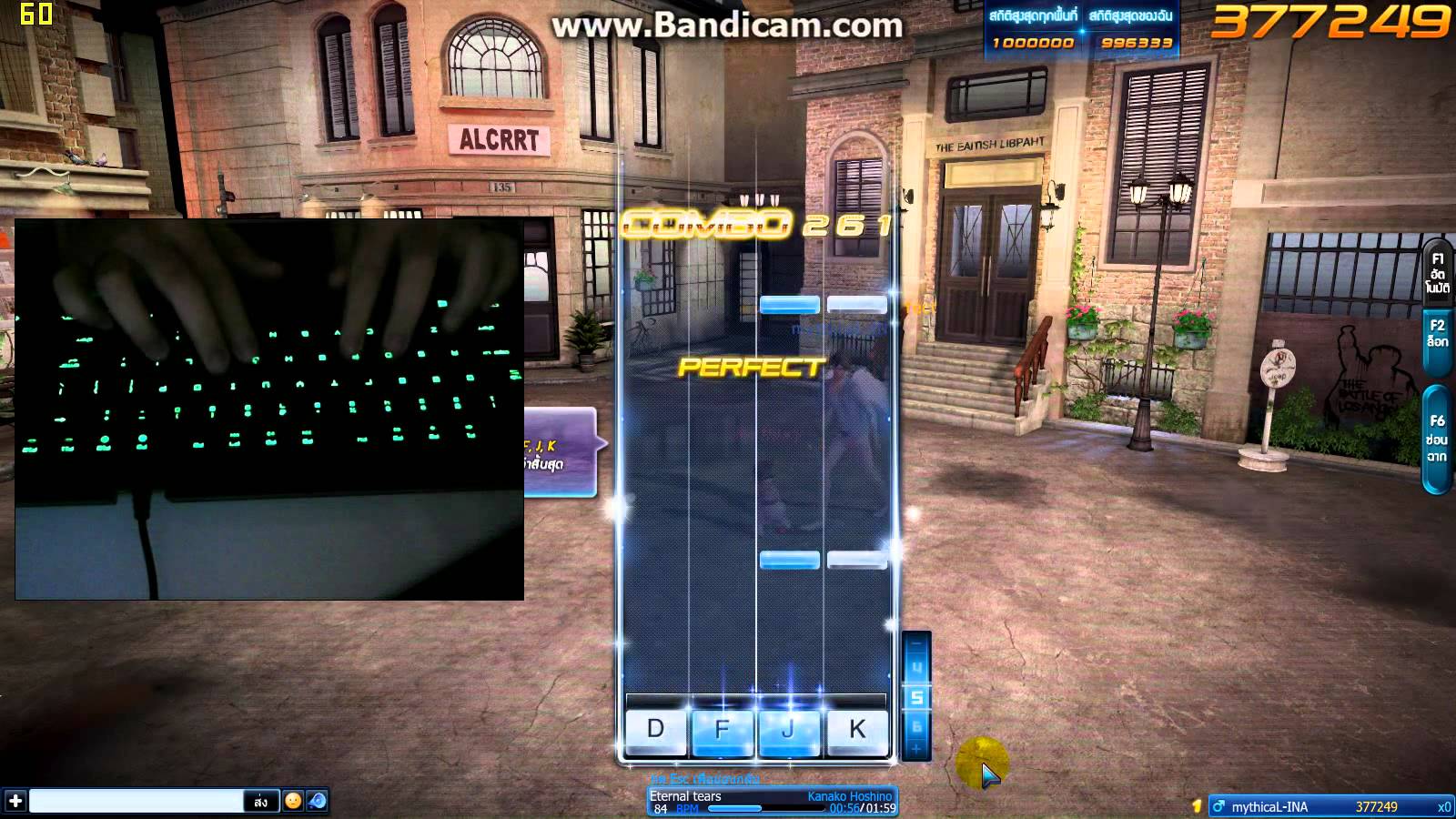 Description: A computer screen with a keyboard and a picture of a building in the background with a window and a clock.