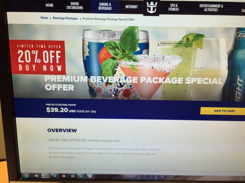 Description: A computer screen with a website page on it that has a picture of beverages on it and a bottle of soda.