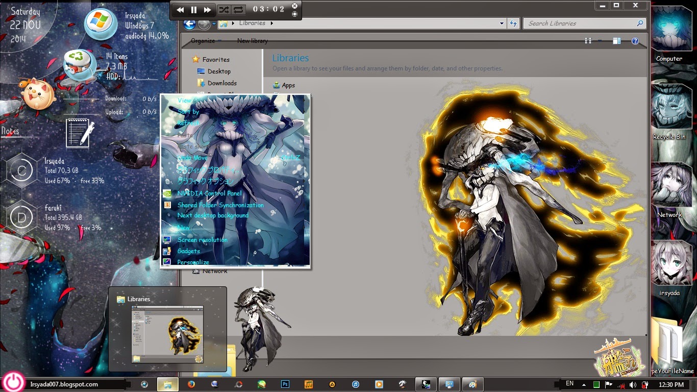 Description: A computer screen with a picture of a woman in a costume and a demon on it's face.
