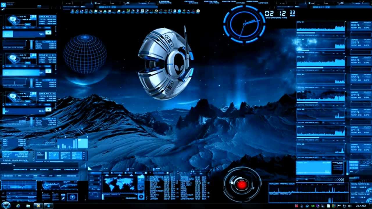 Description: A computer screen with a space theme on it's side and a clock on the screen and a mountain in the background.