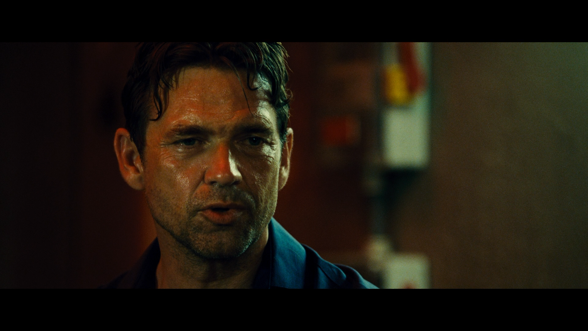 Description: A man with a concerned look on his face in a dark room with a light on his face and a wall in the background.