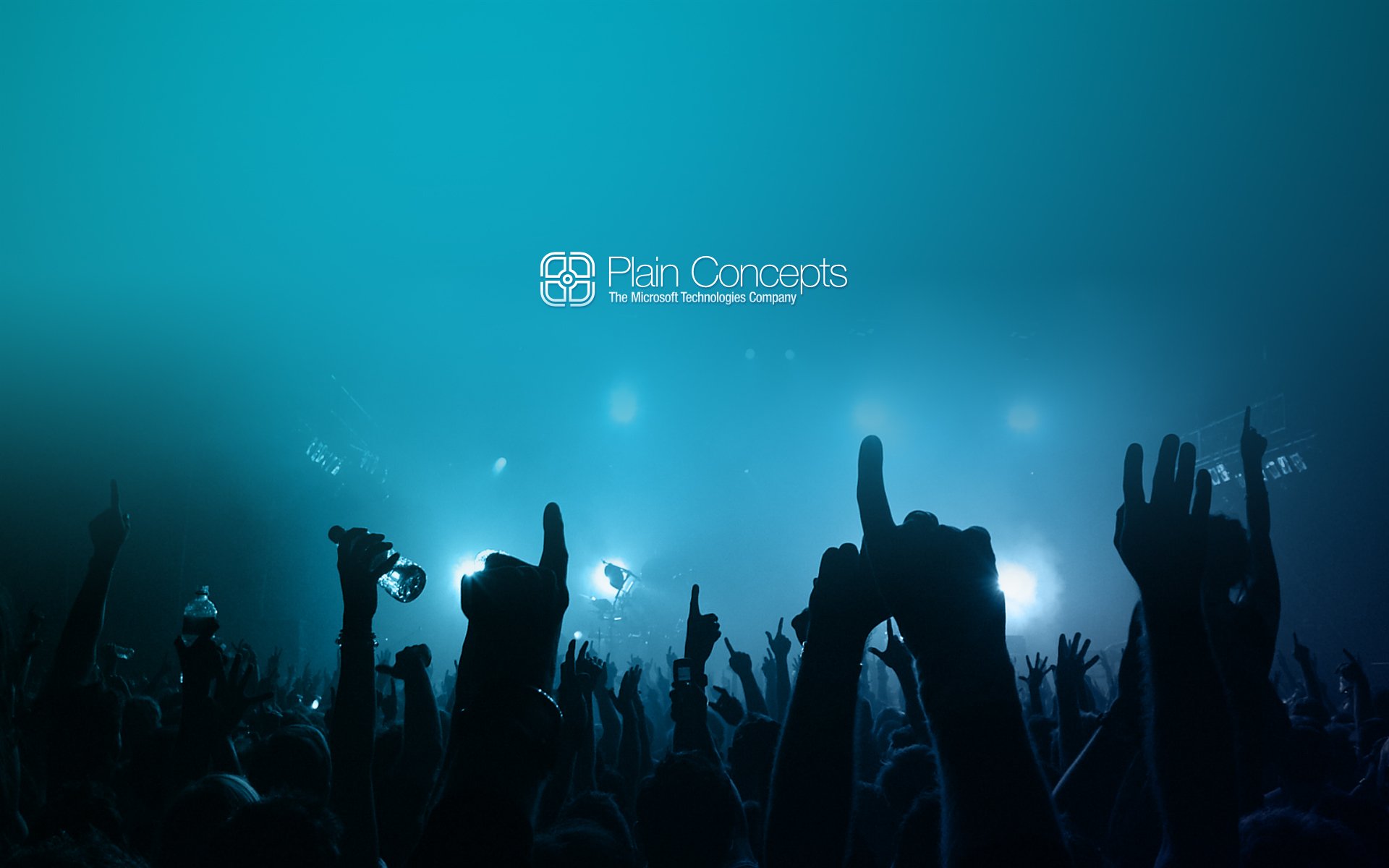Description: A group of people raising their hands in the air at a concert with a blue background and the words plain concepts.