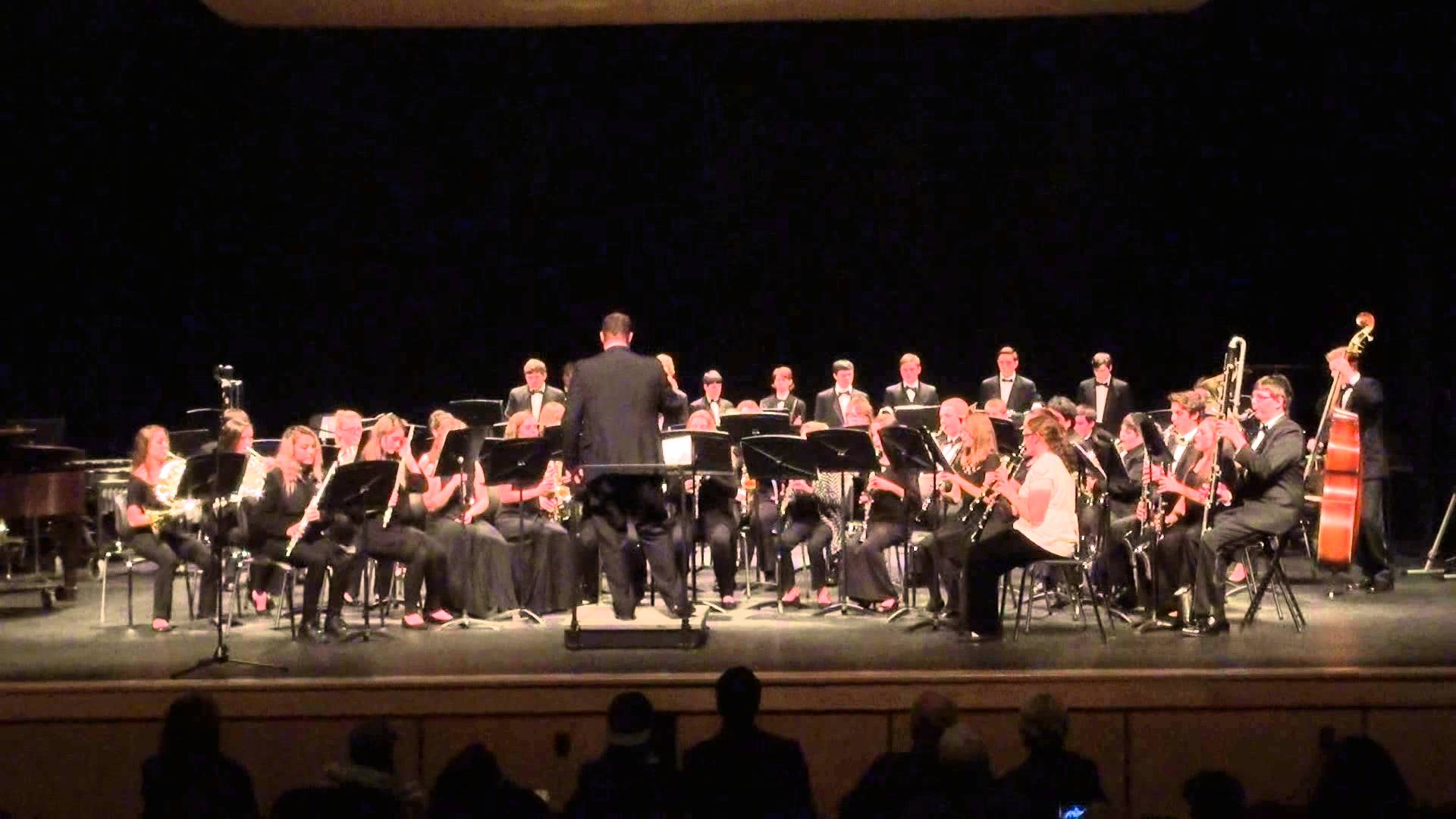 Description: A conductor and orchestra performing on stage at night time with a conductor in the foreground and a conductor in the background.