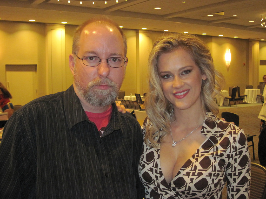 Description: A man and a woman posing for a picture in a conference room with tables and chairs in the background.