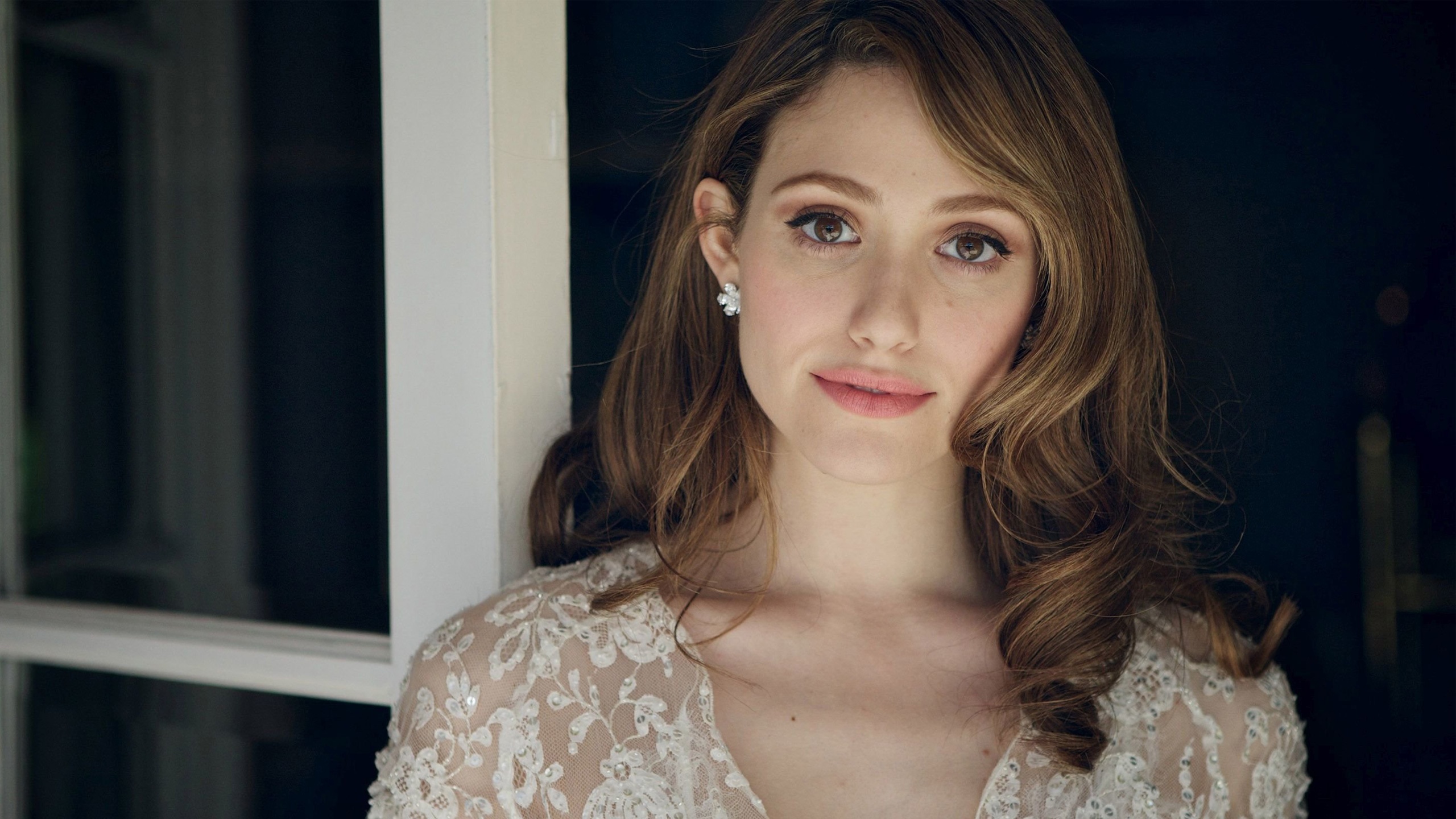 Description: A woman in a white dress is looking at the camera and smiling at the camera with a serious look on her face.