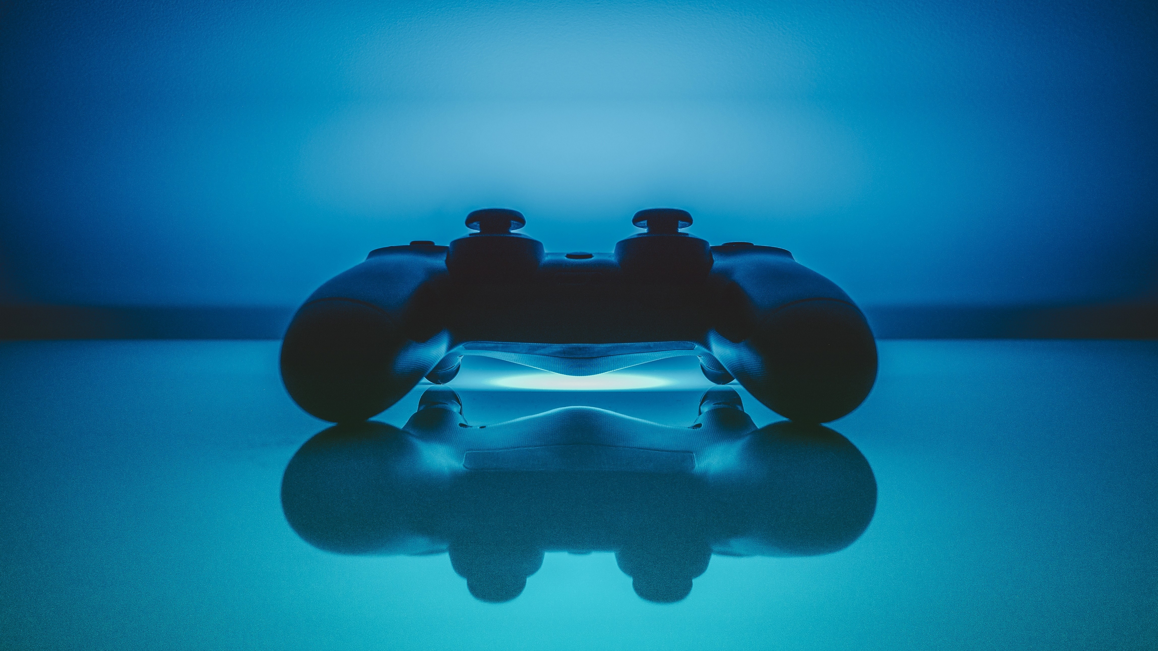 Description: A video game controller sitting on a table with a blue background and a reflection of the controller on the table.