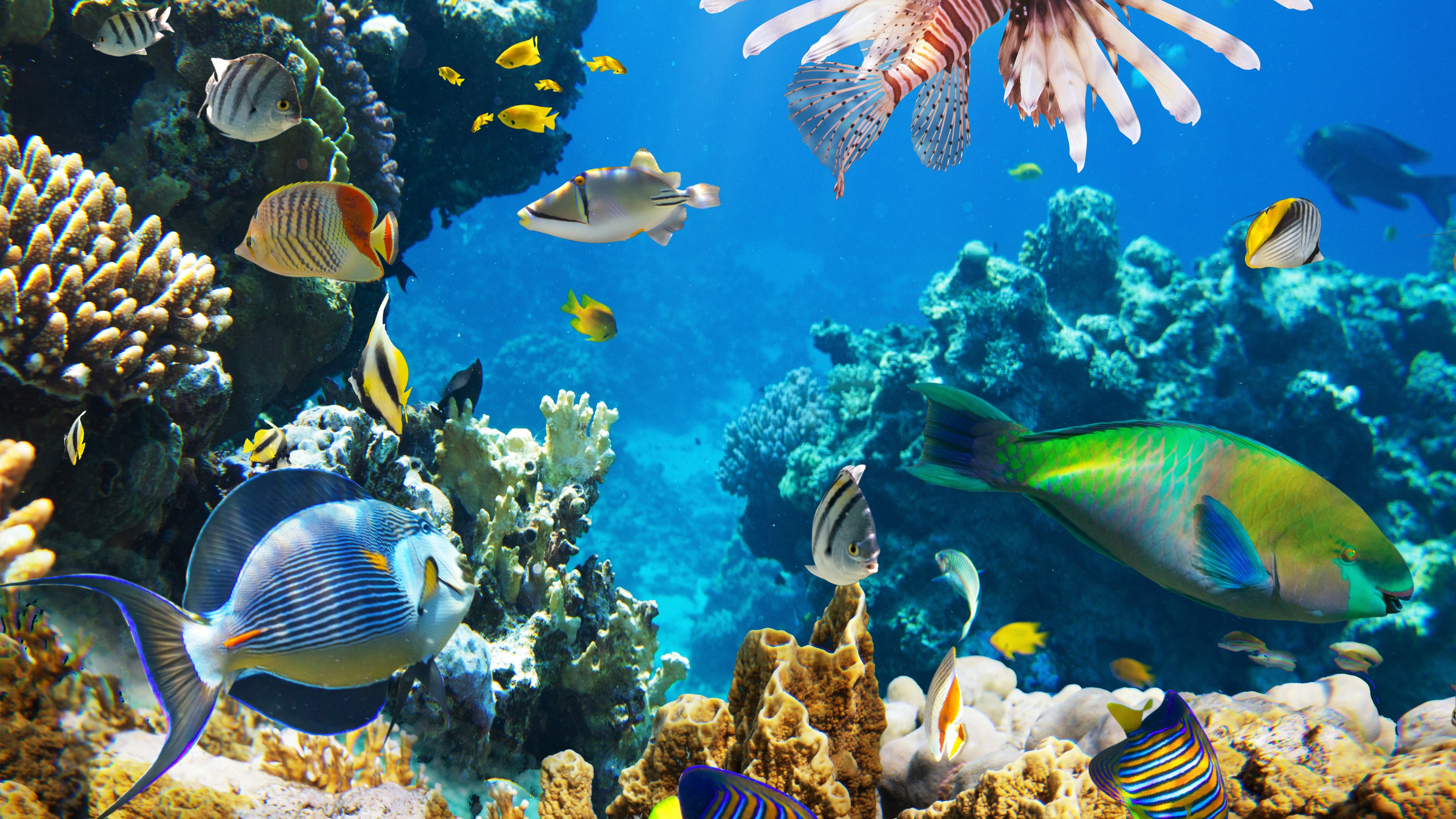 Description: A large group of fish swimming around a coral reef in the ocean with a starfish in the foreground.