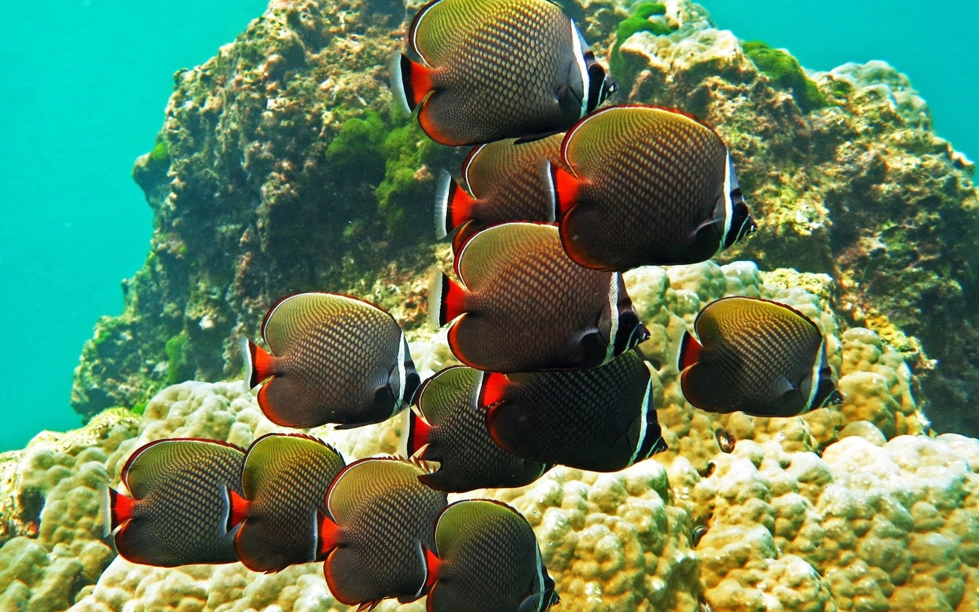 Description: A group of fish swimming in a coral reef with a rock in the background and a blue ocean water.