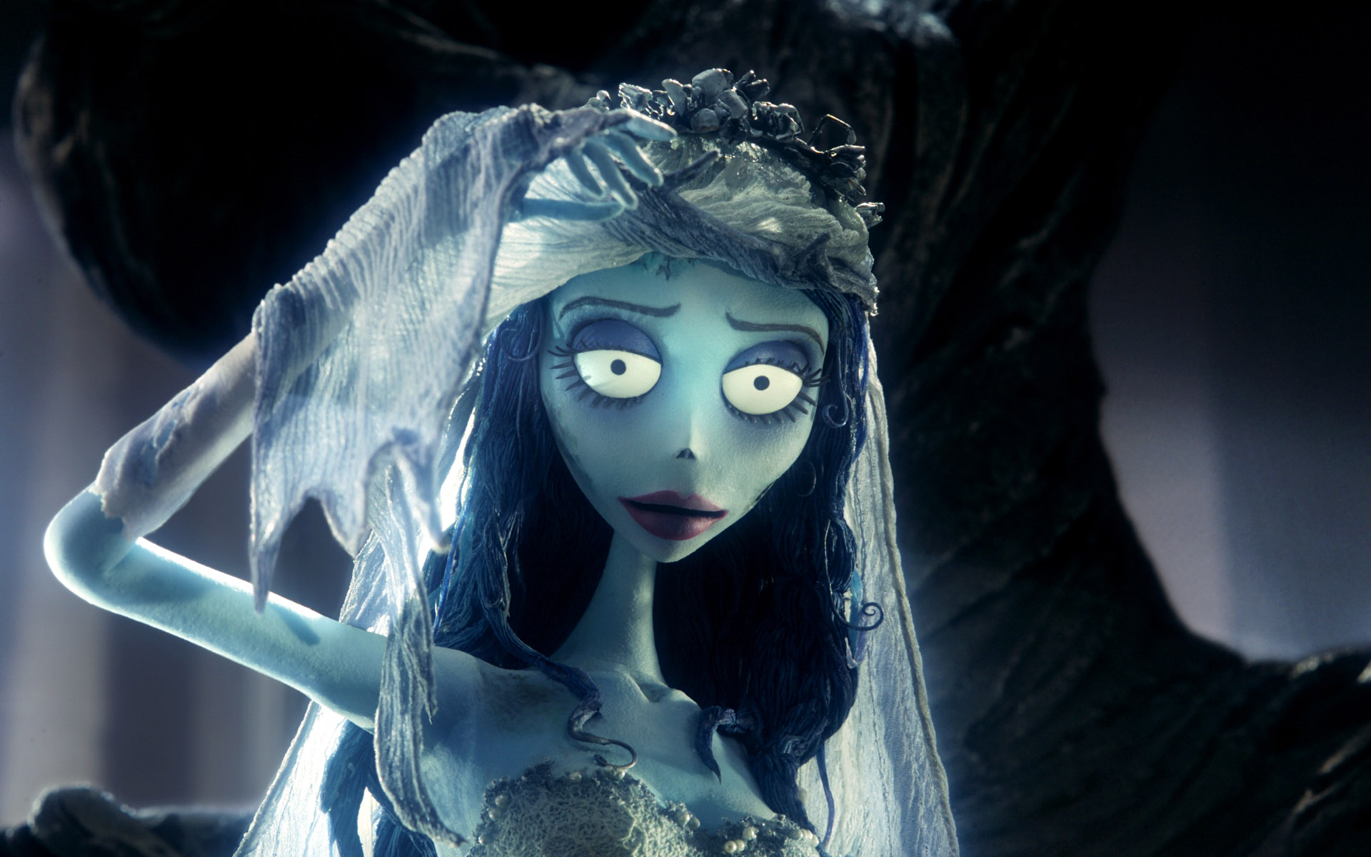 Description: A corpse bride with a veil on her head and eyes.