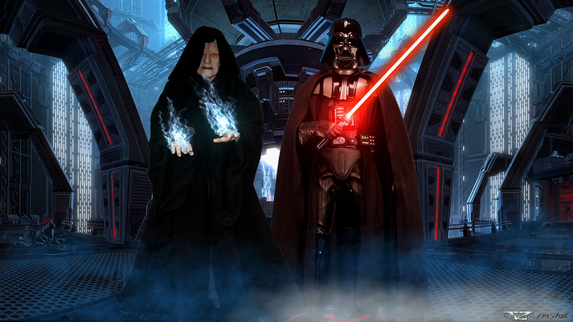 Description: Two people dressed in costumes standing in a room with lights on and a dark background with a red light.