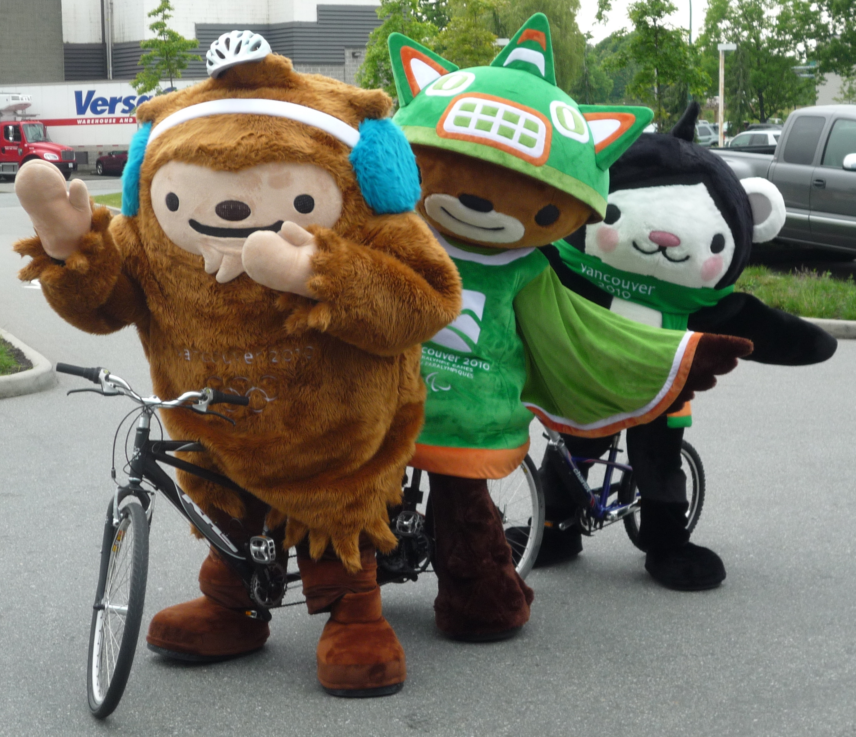 Description: A group of people in costumes on a bike in the street with a cat and dog costume on the back.