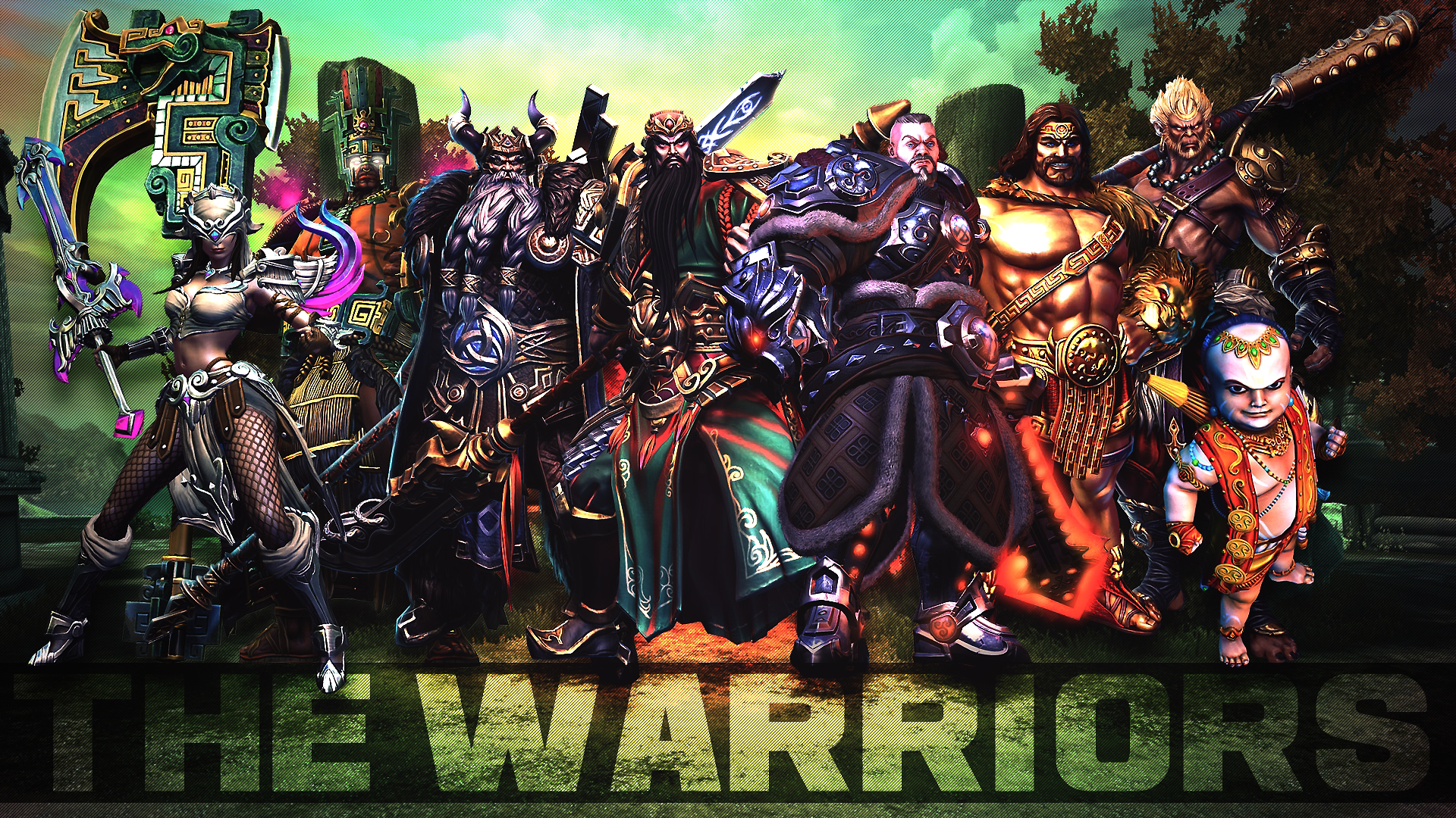 Description: A group of people dressed in costumes and holding swords and standing in front of a green background with the words the warriors.