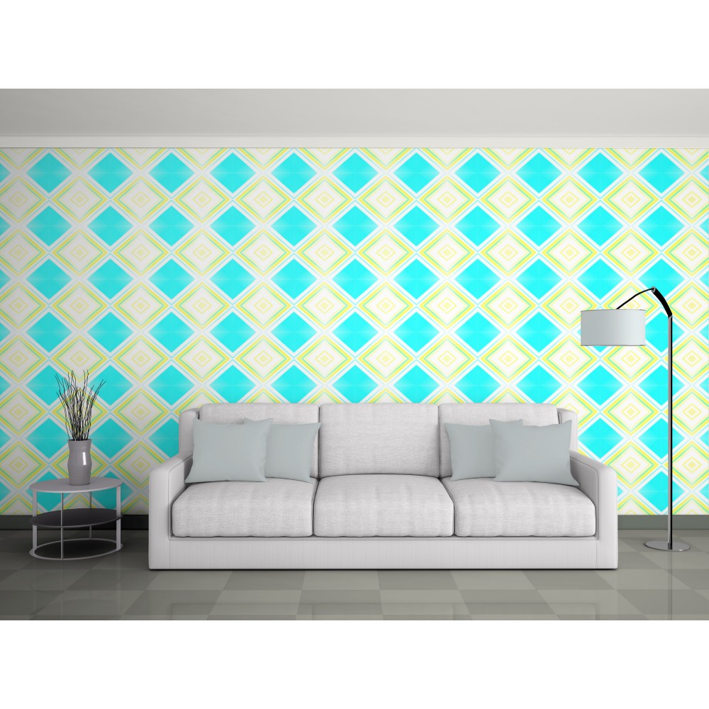 Description: A couch and a lamp in a room with a wallpaper pattern on the wall and a lamp on the floor.