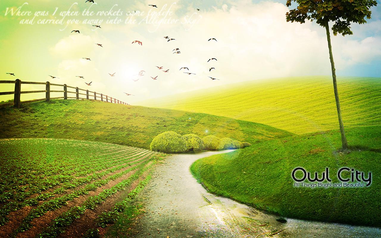 Description: A picture of a country road with birds flying over it and a tree in the distance with a quote above it.