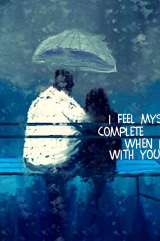 Description: A couple sitting on a bench under an umbrella with a quote on it that reads.