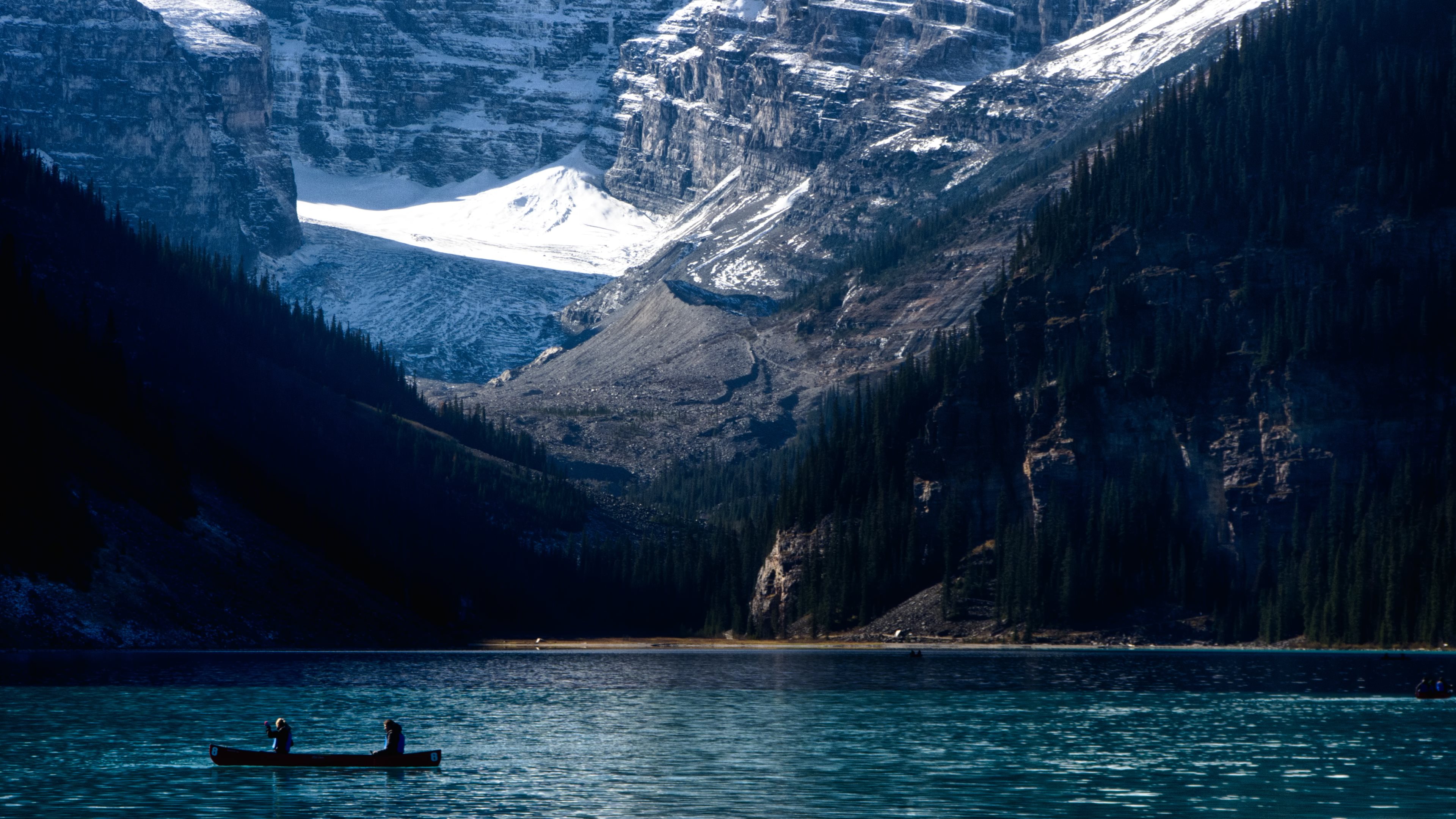 Description: A couple of people in a boat on a lake near mountains and trees with snow on them and a mountain in the background.