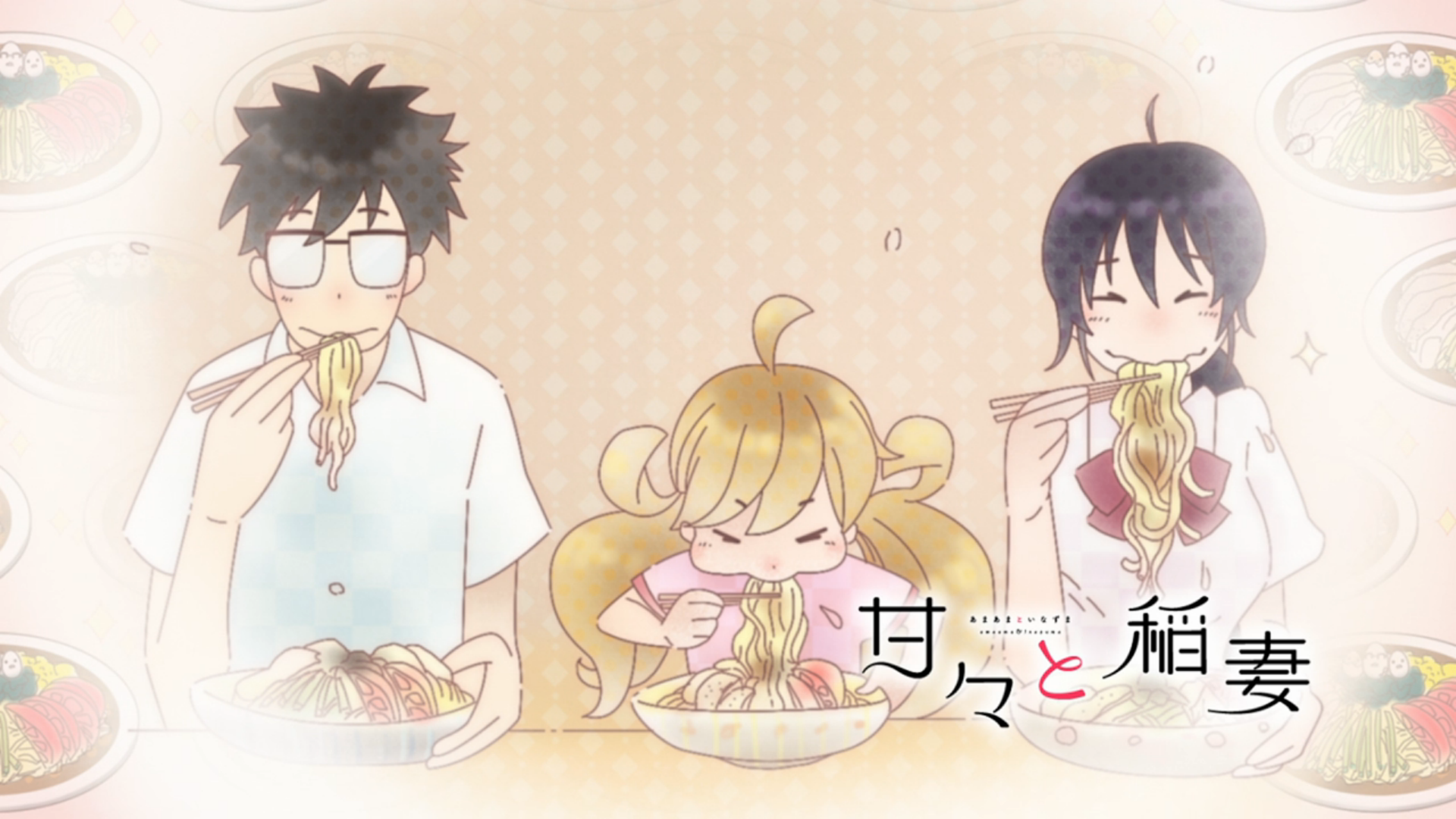 Description: A couple of people that are eating some food together in a room with a wallpaper behind them that says.