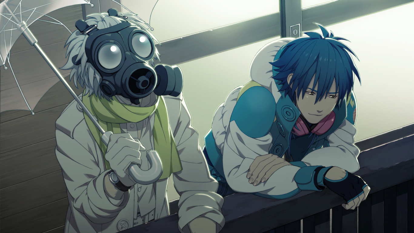 Description: A couple of people with gas masks on standing next to each other on a balcony with a fence and a window.
