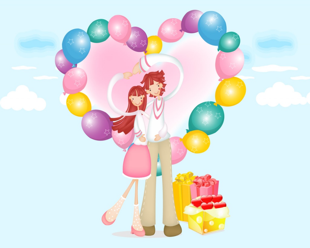 Description: A couple standing next to a heart shaped balloon with a gift box and a gift box under it on a blue background.
