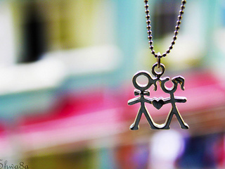 Description: A couple of people holding hands on a chain necklace with a blurry background of a building and a building.