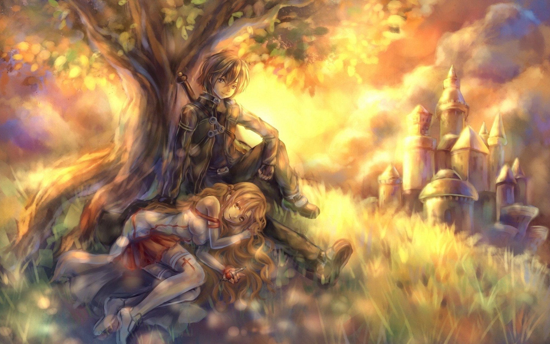Description: A painting of a couple hugging under a tree in a field with a castle in the background and a castle in the background.