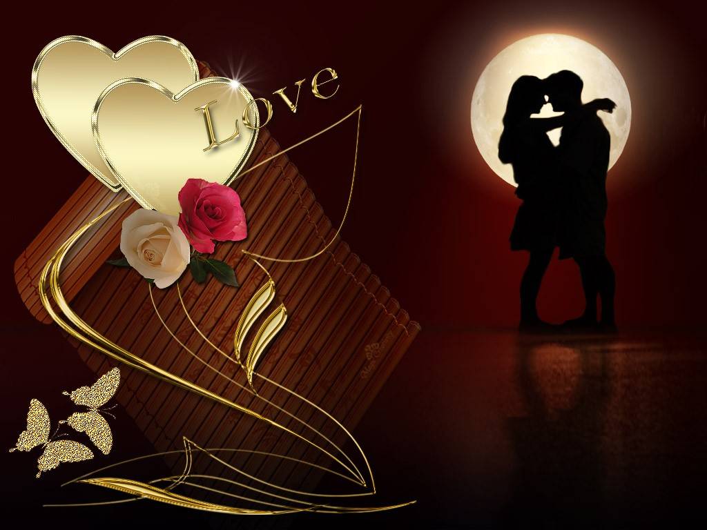 Description: A couple kissing in front of a full moon with a love message on it and a golden heart on the cover.