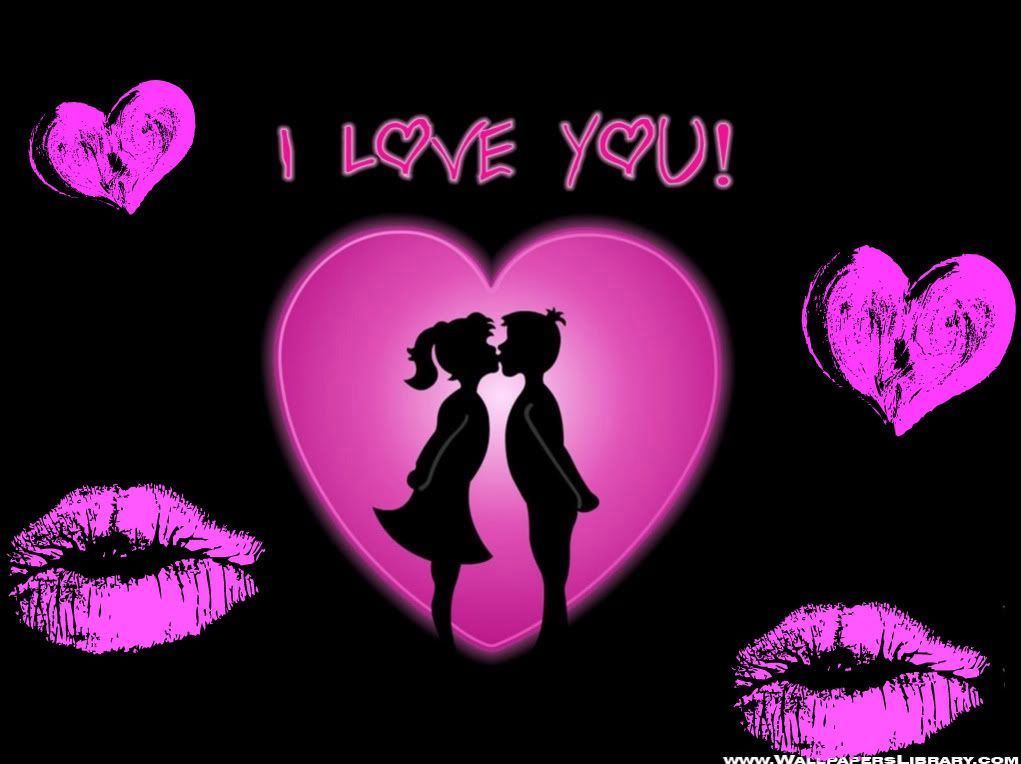 Description: A couple kissing in front of a heart with the words i love you written on it and two hearts.