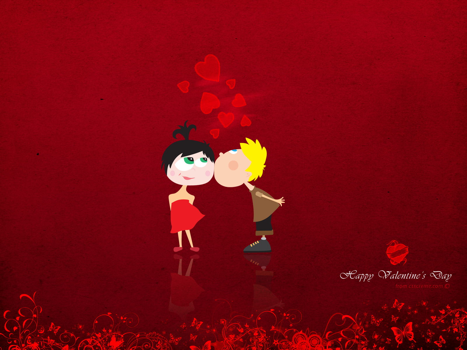 Description: A couple kissing in front of a red background with hearts flying above them and a red background with hearts.