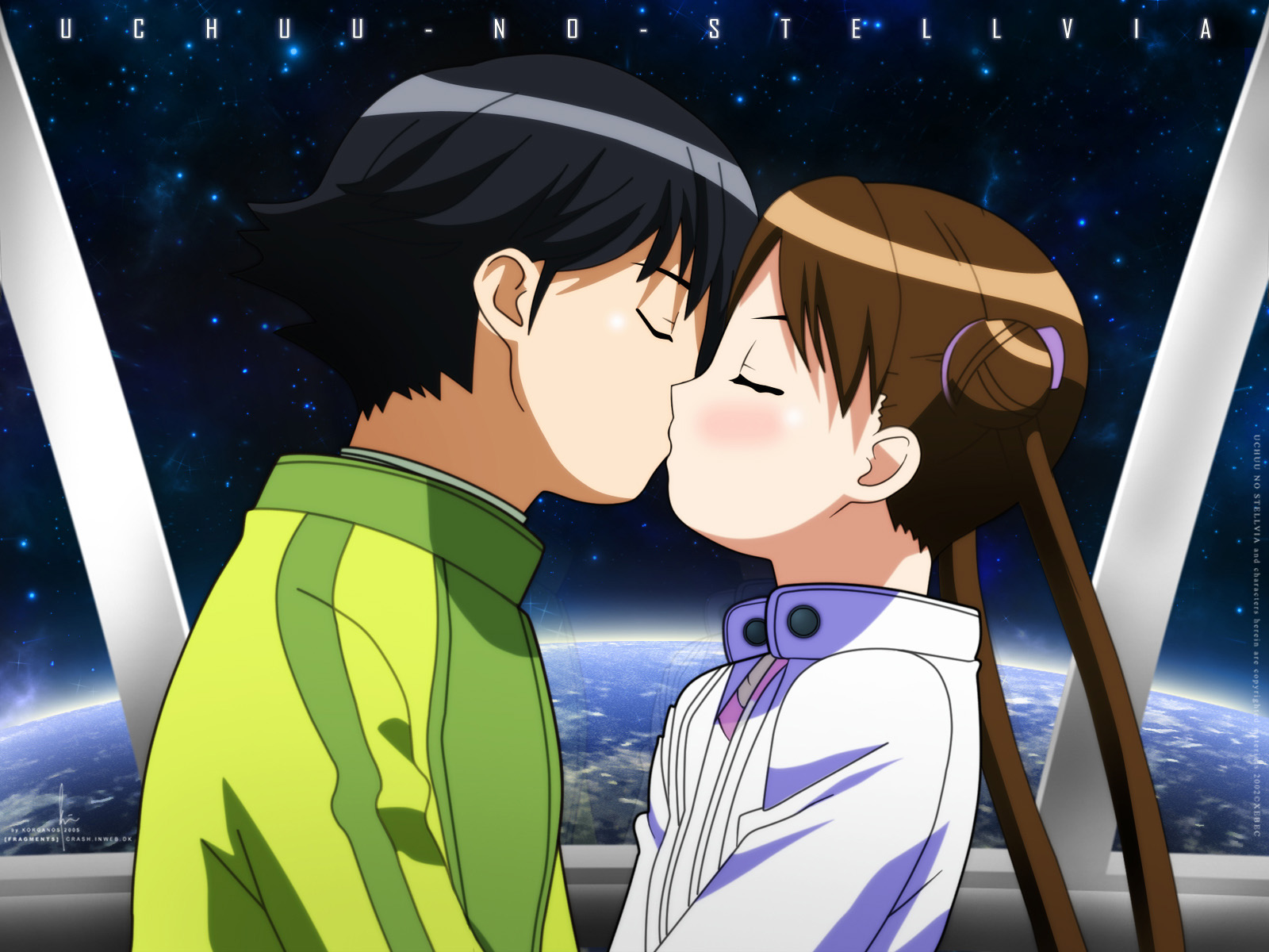 Description: A couple of people that are kissing each other in front of a space station with the earth in the background.