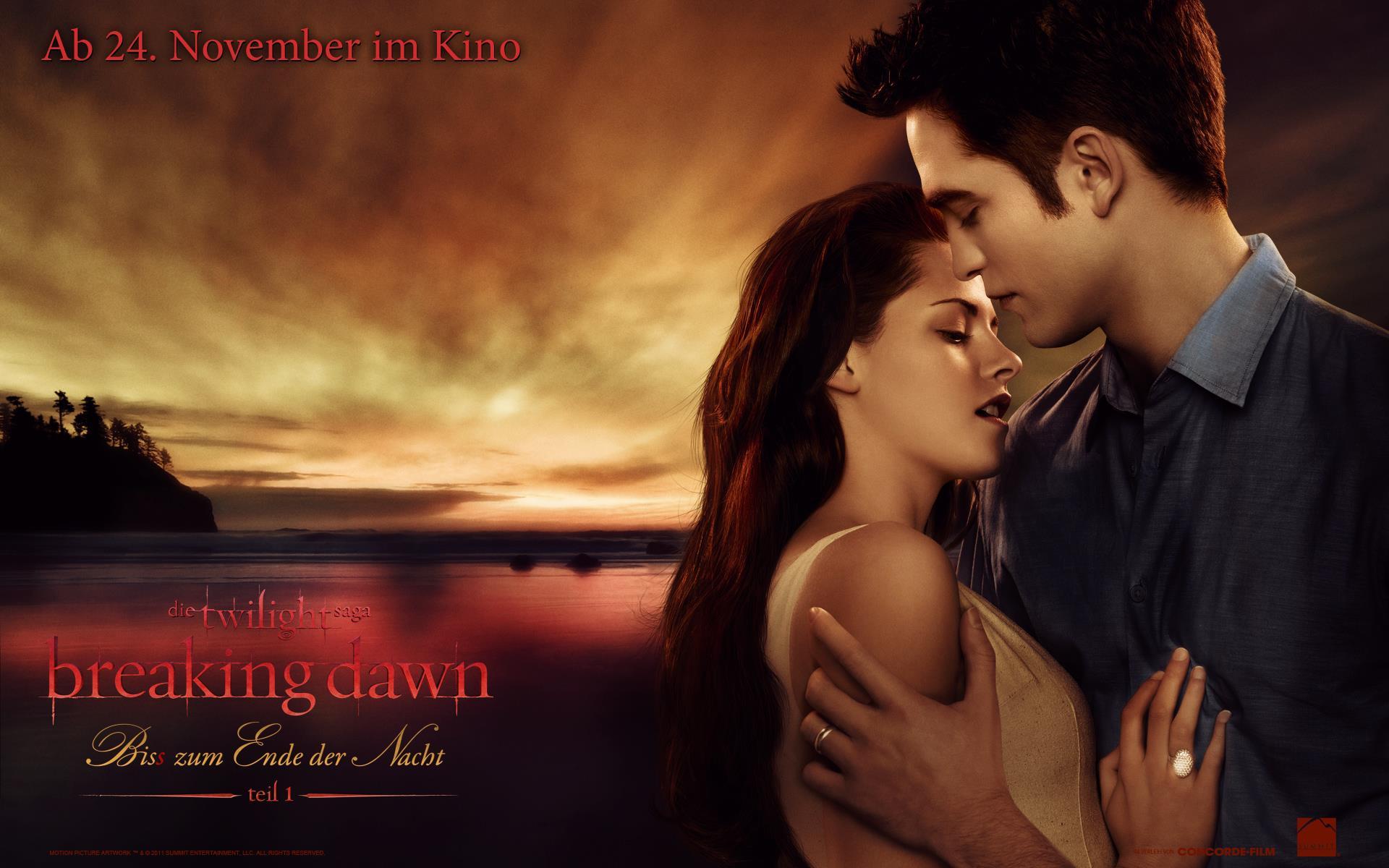 Description: A couple is kissing in front of a sunset and a lake with a castle in the background and a caption that reads breaking dawn.