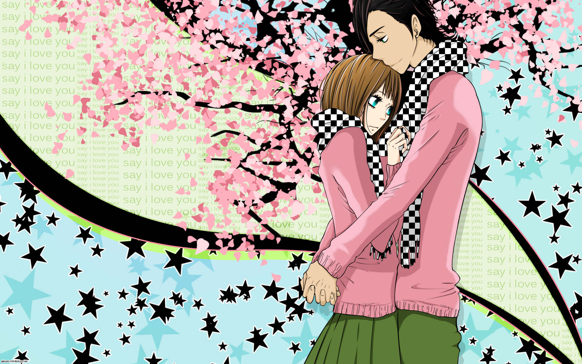 Description: A couple kissing under a tree with stars in the background and a pink blossom tree in the foreground.