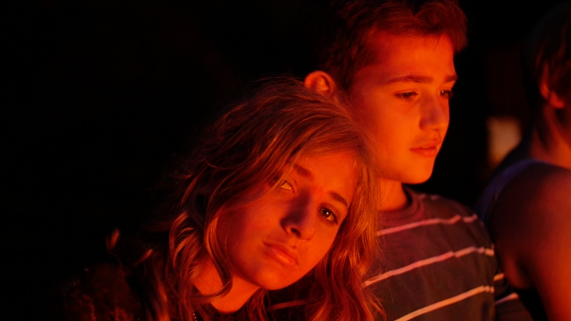 Description: A couple of people that are looking at a cake with candles on it and a candle in the middle of the picture.