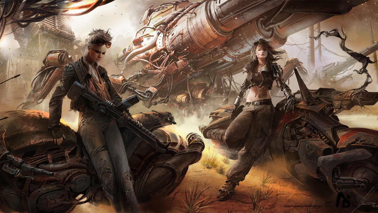 Description: A couple of people standing next to a motorcycle in a desert area with a giant machine behind them and a giant robot in the background.