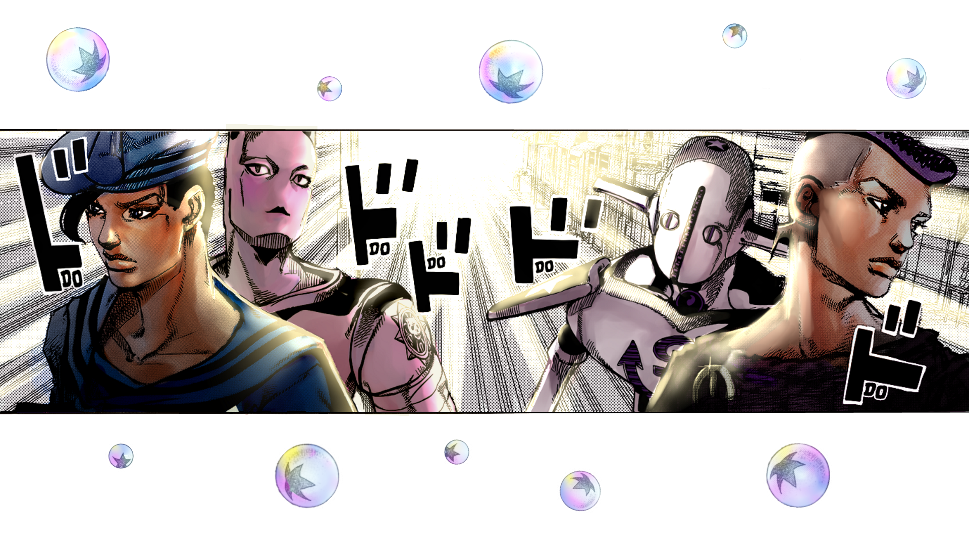 Description: A couple of people standing next to each other in front of bubbles of soapy water on a white background.
