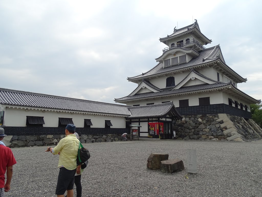 Description: A couple of people standing in front of a building with a tower on top of it and a stone wall.