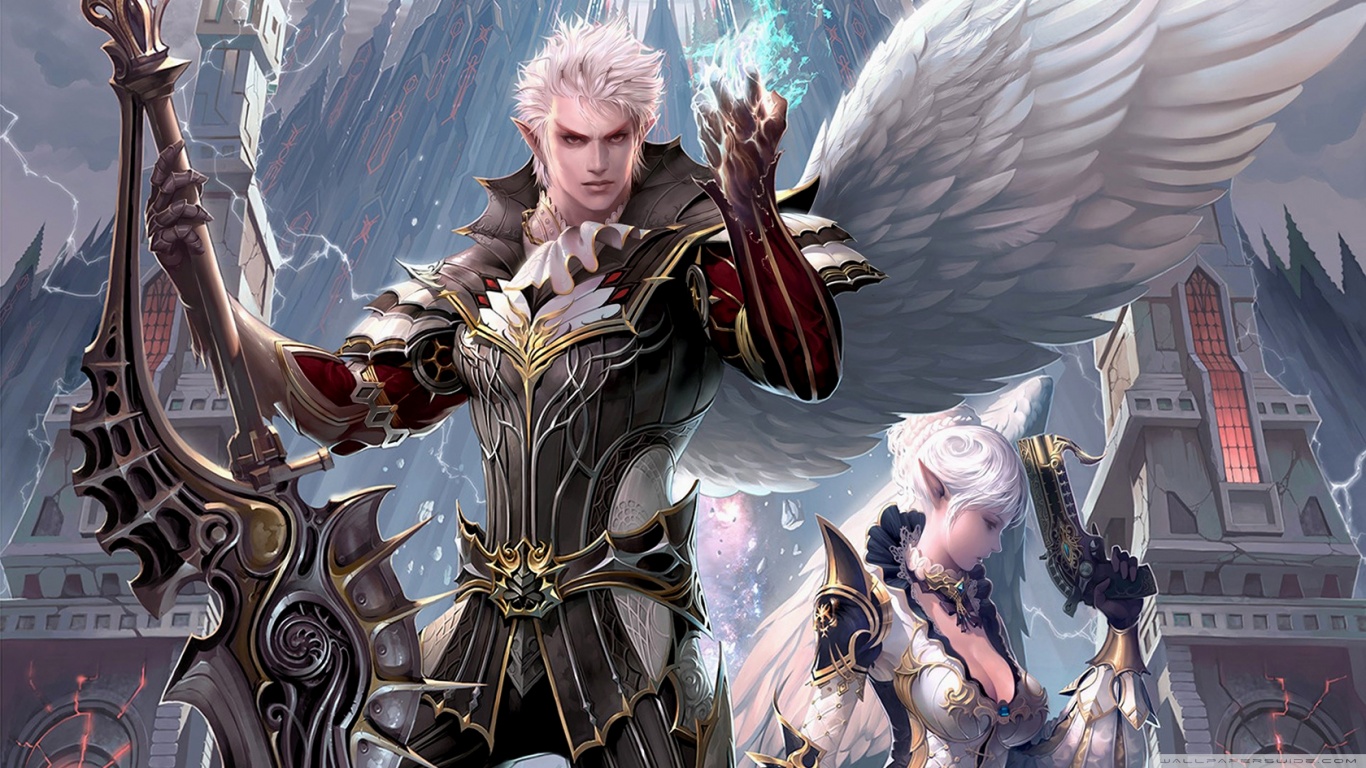 Description: A couple of people standing next to each other in front of a castle with wings on it and a sword.