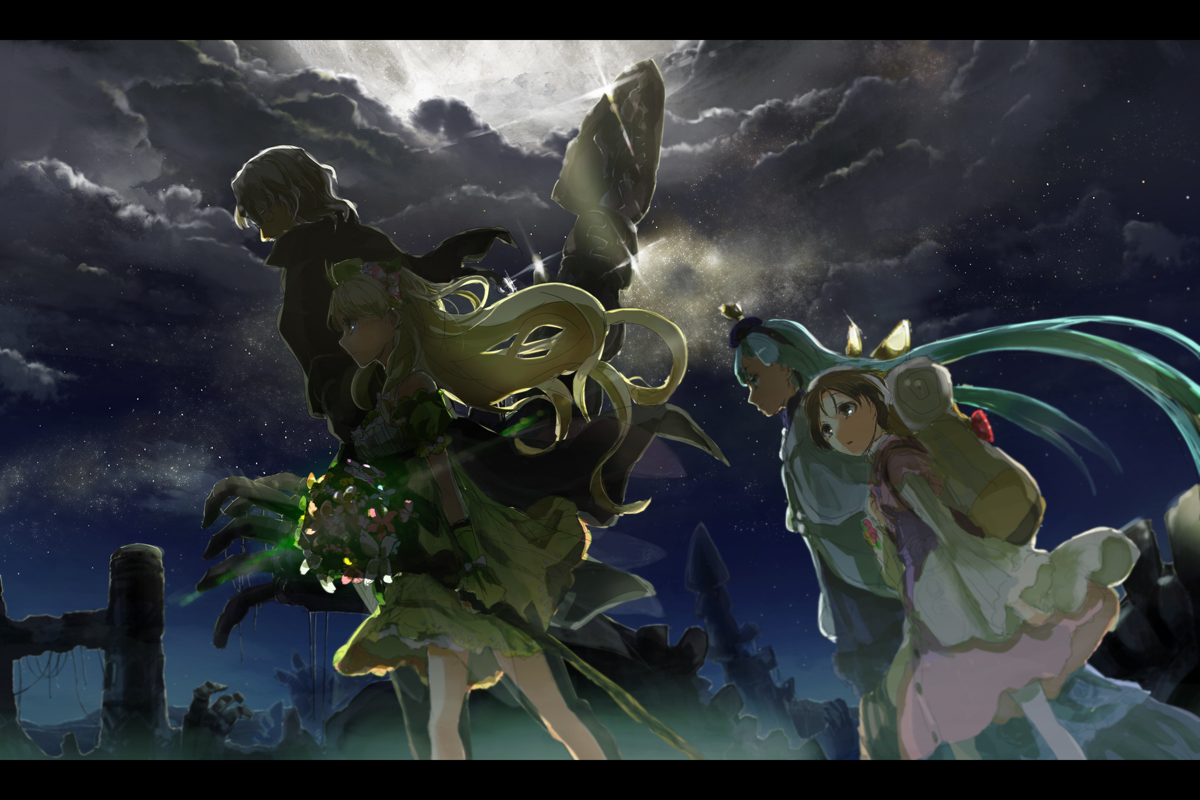 Description: A couple of people standing next to each other in a field at night with a sky background and clouds.