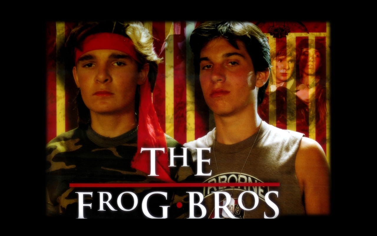 Description: A couple of people standing next to each other in front of a flag and a poster with the words the frog bros.