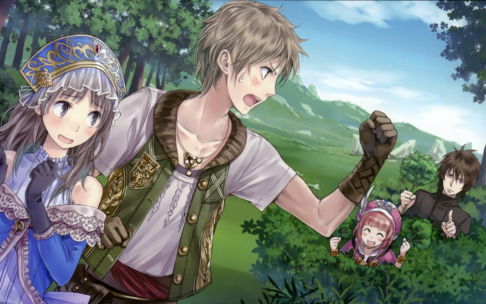 Description: A couple of people standing in a forest with trees and bushes behind them.