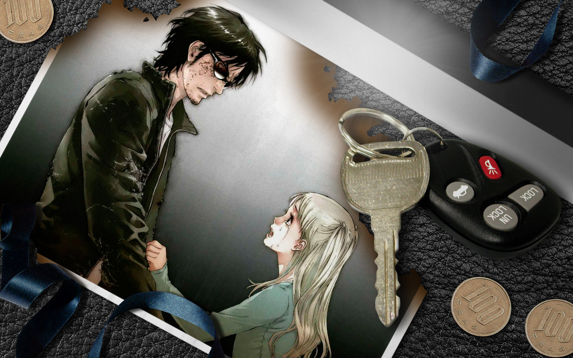 Description: A couple of people standing next to a key and a car key chain on a table with a couple of keys.