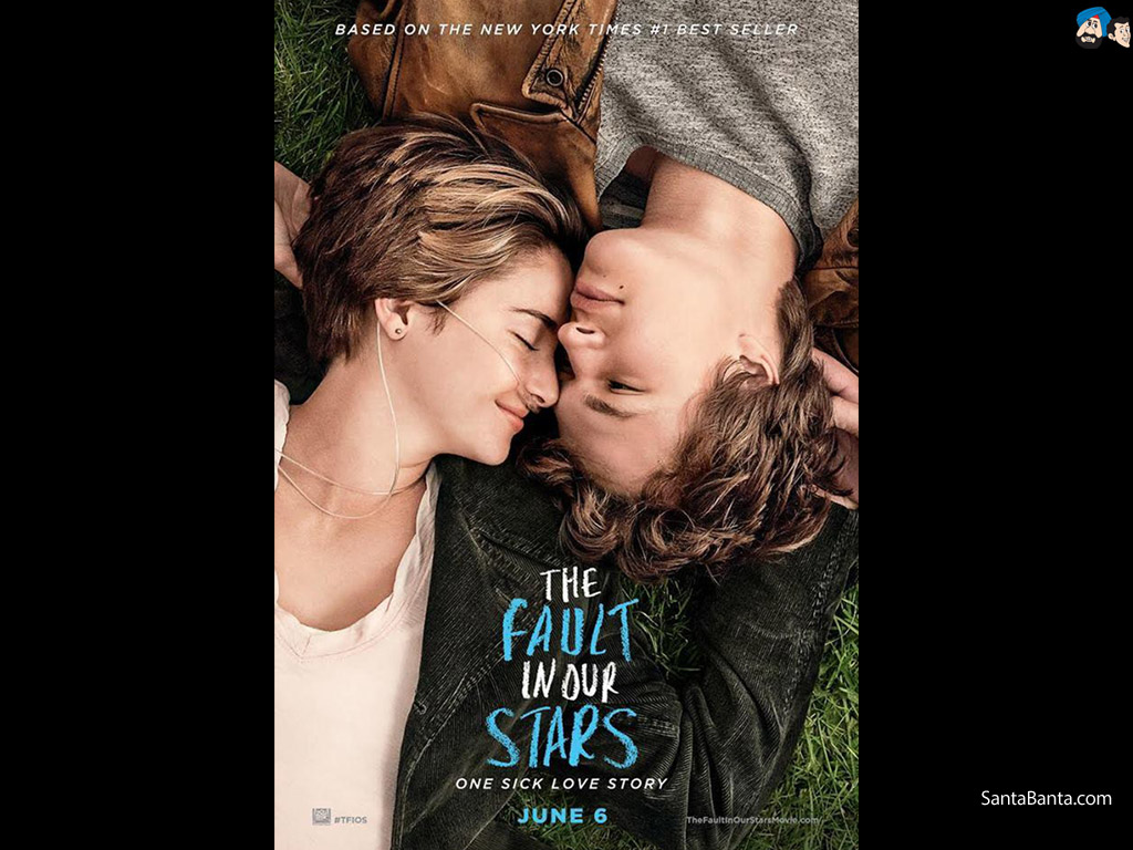 Description: A couple of people laying on top of each other on the grass with the words the fault in our stars.