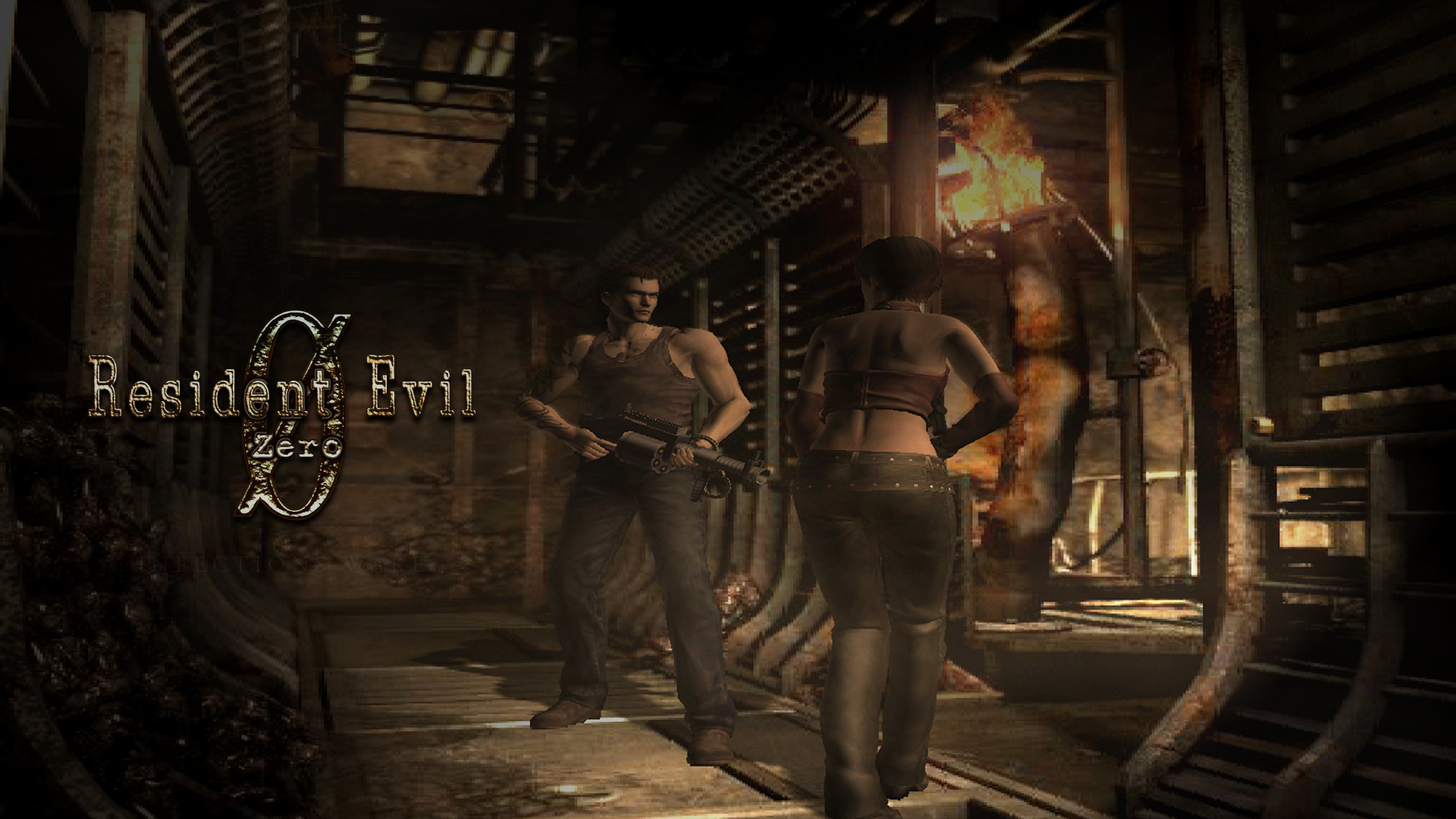 Description: A couple of people standing in a room with a fire in the background and a sign that says resident evil zero.