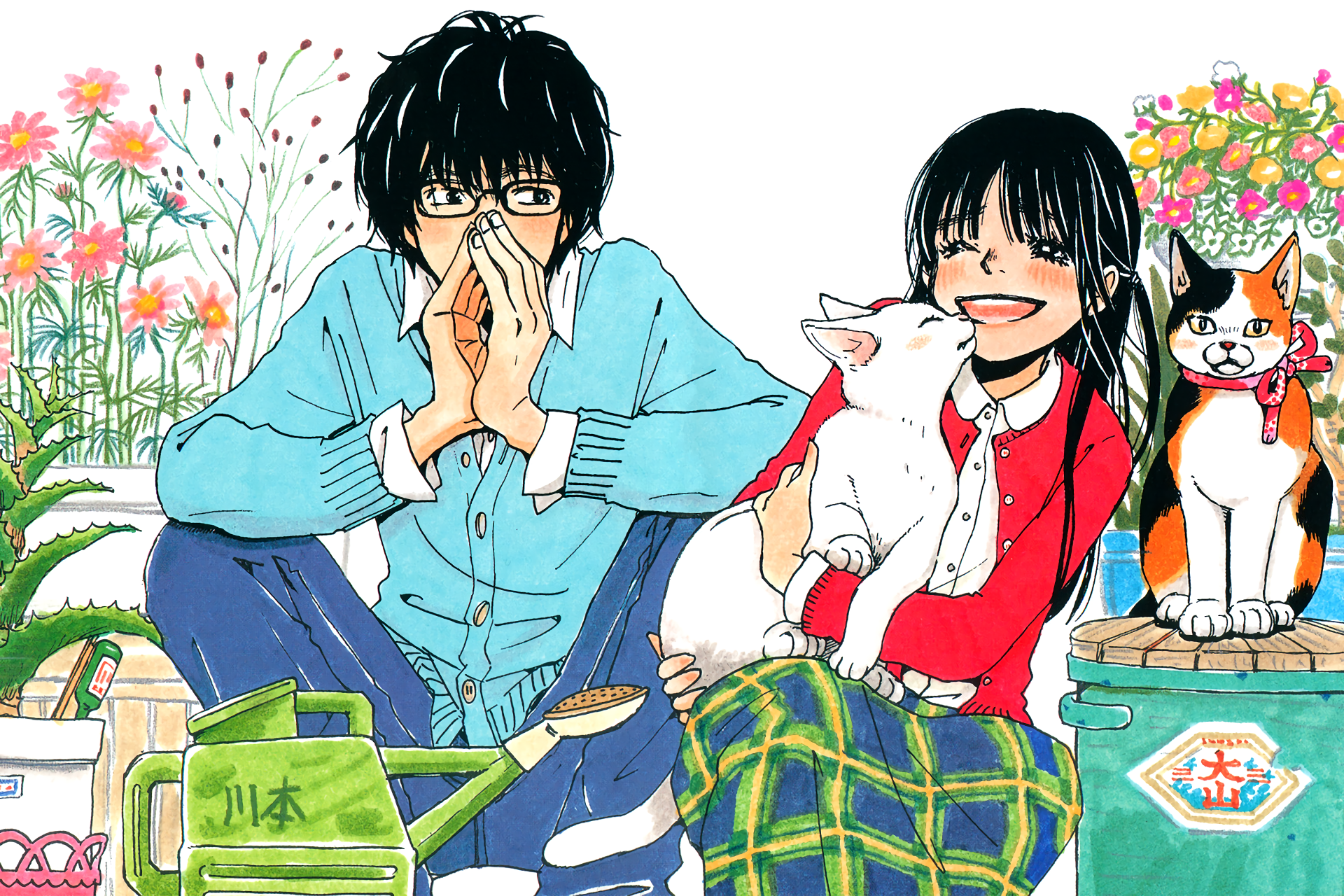 Description: A couple of people sitting next to each other with a cat on their lap and a cat on their lap.