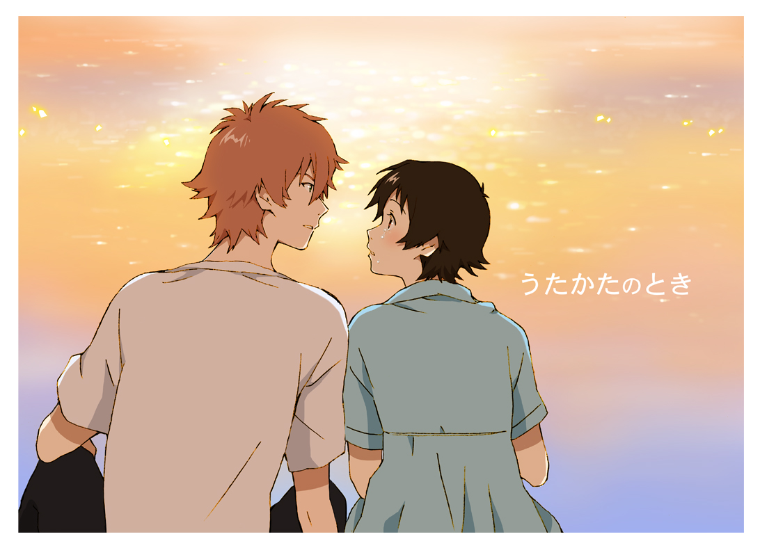 Description: A couple of people standing next to each other near a sky background with stars and clouds in the background.