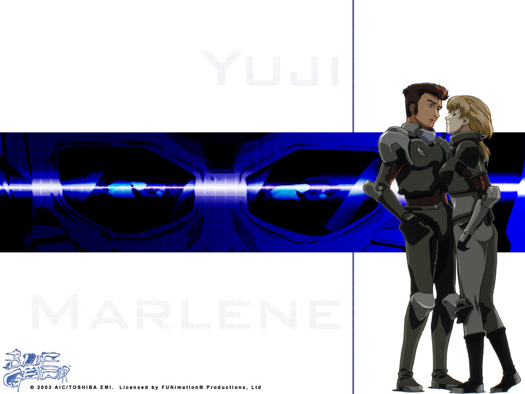 Description: A couple of people standing next to each other in front of a blue background with a white and black stripe.